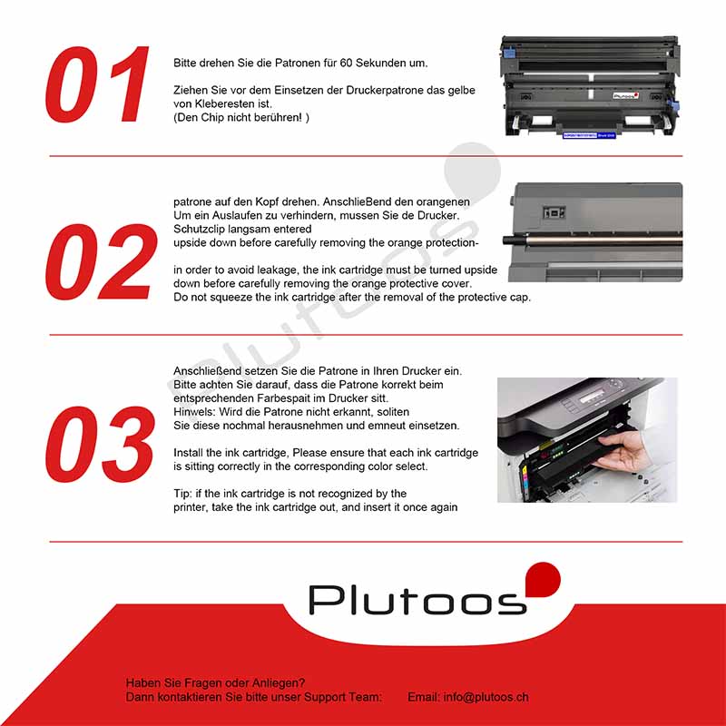 Ink and toner cartridges from Plutoos are perfectly matched to the compatible hardware and therefore deliver excellent print quality at all times without any problems. Plutoos emphasises high-quality workmanship, resilient materials, an exact fit and very good print quality.