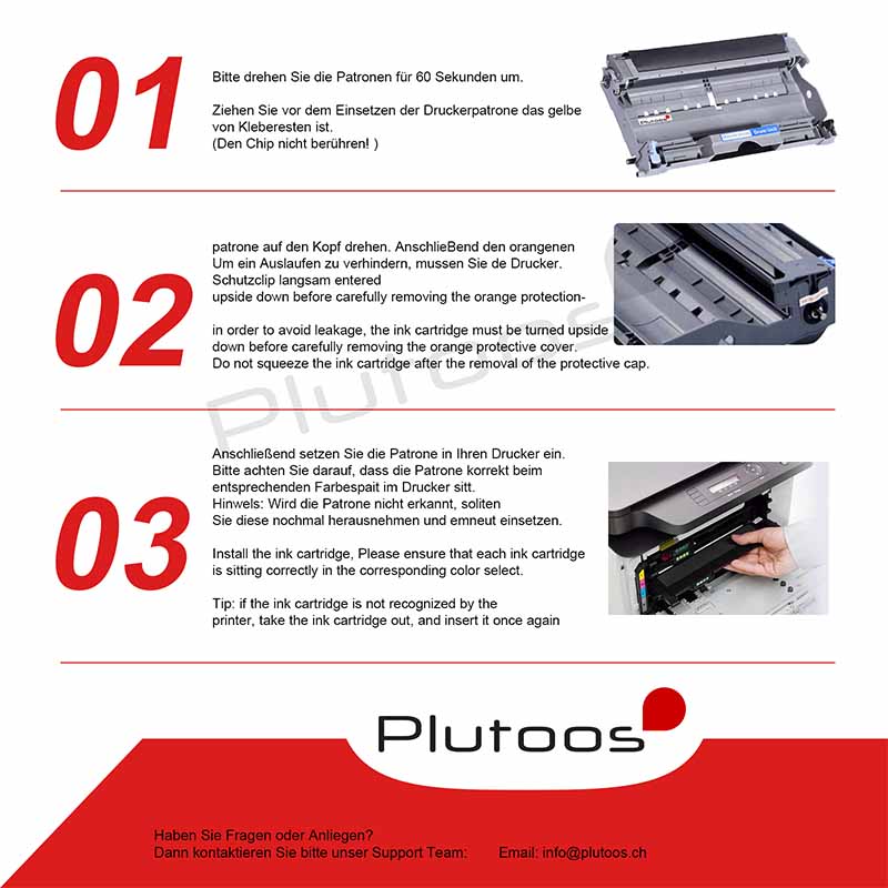 Tinten- und Tonerpatronen von Plutoos sind perfekt auf die kompatible Hardware abgestimmt und liefern so störungsfrei jederzeit exzellente Druckqualität. Plutoos legt Wert auf hochwertige Verarbeitung, belastbare Materialien, exakte Passgenauigkeit und eine sehr gute Druckqualität.