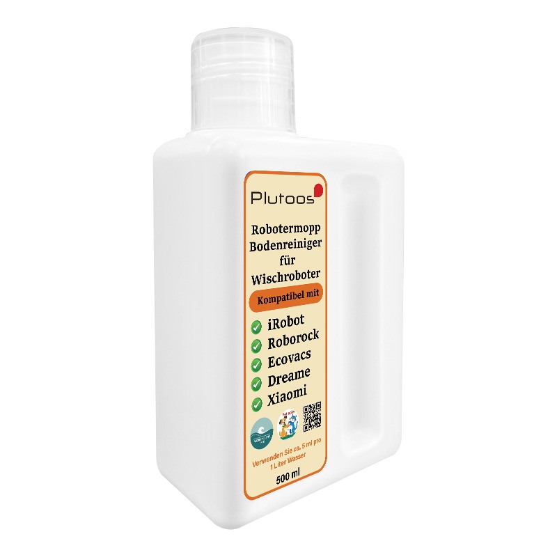Die Plutoos Robo Mop Wischloesung wurde speziell fuer Wischroboter entwickelt. Die Schweizer Formel sorgt fuer streifenfreien Glanz auf allen Hartboeden und haelt zugleich die Wasserwege und Mopppads sauber. Tierfreundlich bei sachgemaesser Anwendung und zu 100% mikroplastikfrei.