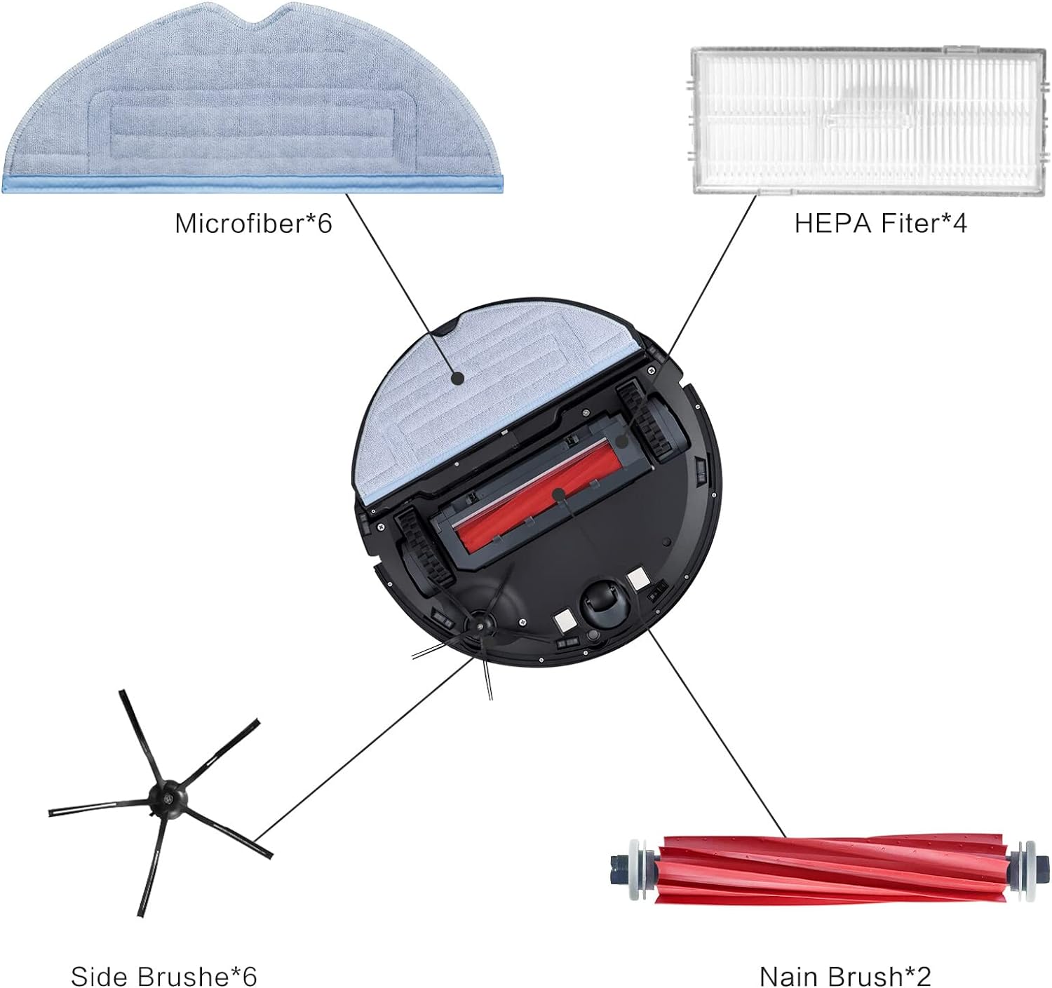 - 📌 Packungsinhalt: 4 × Hauptbürsten, 4 × HEPA-Filter, 4 × Wischmopps / Wischtücher, 6 × Seitenbürsten, 2 × Reinigungswerkzeuge
