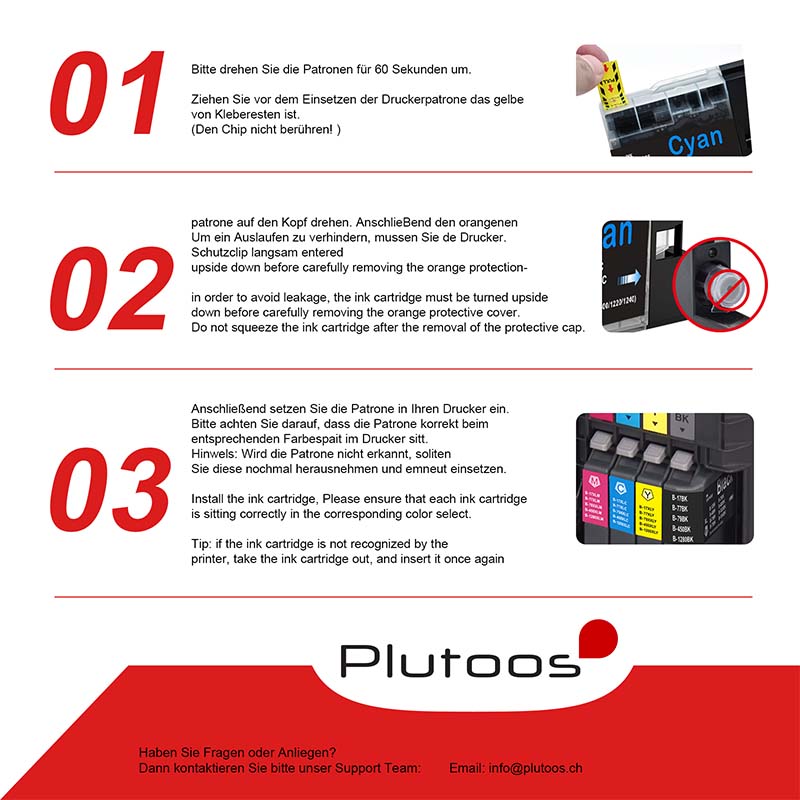 Tinten- und Tonerpatronen von Plutoos sind perfekt auf die kompatible Hardware abgestimmt und liefern so störungsfrei jederzeit exzellente Druckqualität. Plutoos legt Wert auf hochwertige Verarbeitung, belastbare Materialien, exakte Passgenauigkeit und eine sehr gute Druckqualität.