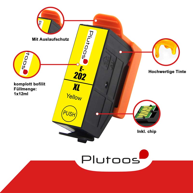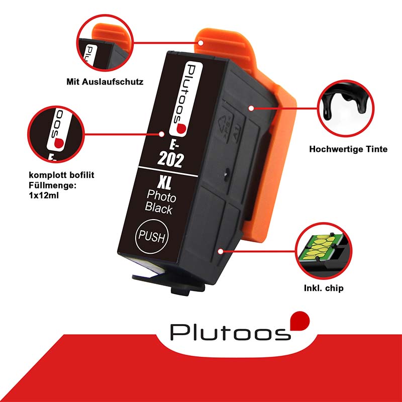 Das Plutoos 202XL Multipack ist ein kompatibles 5er-Set fuer scharfe Dokumente, klare Texte und hochwertige Farbfotos im Alltag. Das Set ist passend fuer ausgewaehlte Epson Expression Premium Drucker, die die Epson 202 / 202XL Patronenfamilie verwenden, darunter XP-6000, XP-6005, XP-6100 und XP-6105. Die Claria-Premium-Patronenfamilie kombiniert Schwarz, Photo Black, Cyan, Magenta und Gelb fuer eine ausgewogene Mischung aus gestochen scharfem Text und brillanten Fotodrucken.